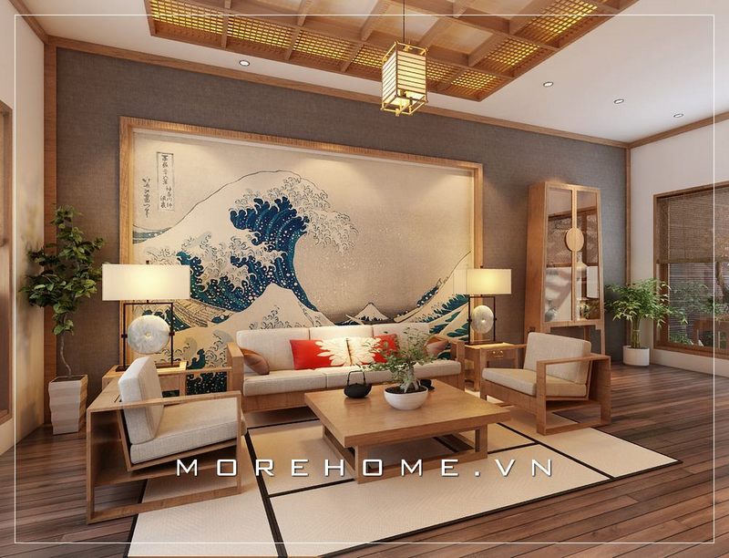 Bố trí phòng khách chung cư phong cách Nhật Bản ấn tượng với cách lựa chọn bức tranh treo tường treo tường sắc xanh nổi bật giữa một không gian gỗ mộc mạc.