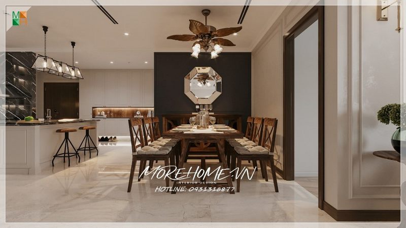 Chiếc đèn hình lá phong cách tân cổ điển hiện đại có thẩm mĩ cao với vẻ vẻ bề ngoài. Chiếc gương lục giác treo tường trang trí phòng ăn cũng đẹp mắt không kém tạo sức hút mạnh mẽ cho phòng