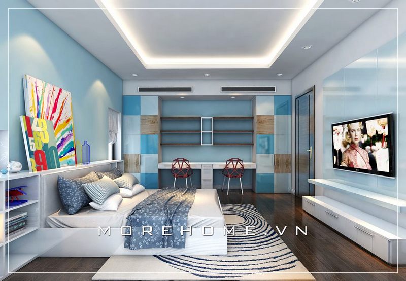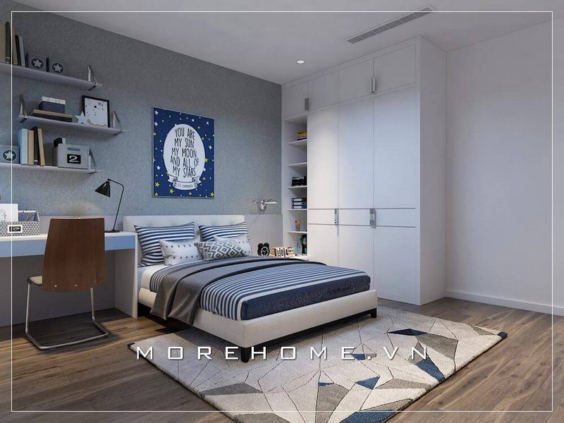 Trang trí nội thất phòng ngủ 2 bé trai với mẫu tủ áo độc đáo kết hợp bàn học hiện đại