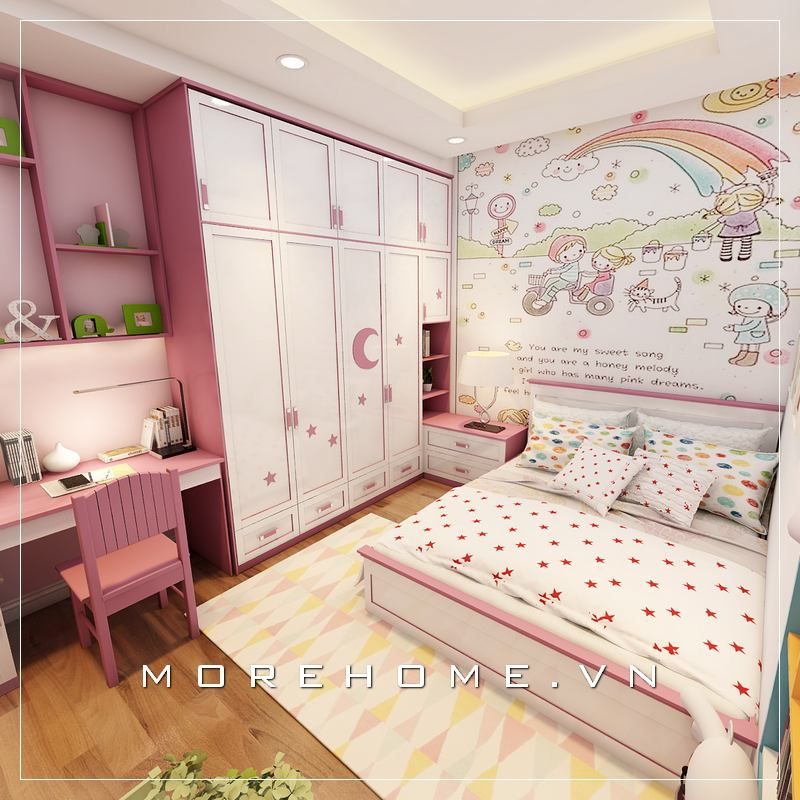 Mẫu tủ quần áo bé gái cánh mở hiện đại đầy tiện dụng, kết hợp kệ sách và bàn làm việc mang lại cho con thuận tiện hơn trong quá trình nghỉ ngơi, học tập