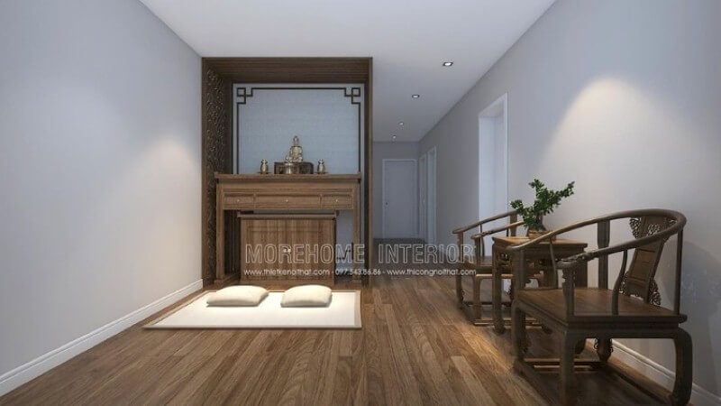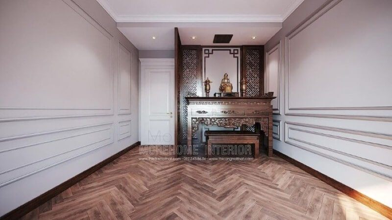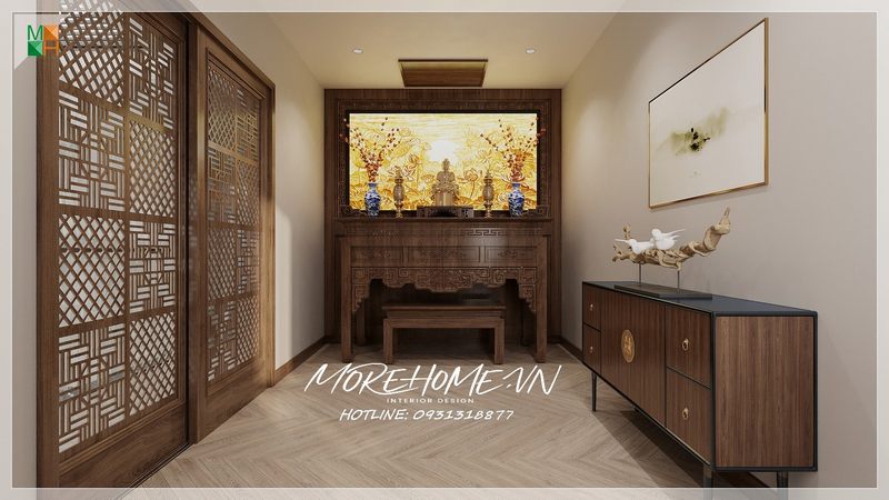 Thiết kế nội thất phòng thờ chung cư CT4 Mỹ Đình đẹp với đồ nội thất gỗ tông màu nâu sáng.