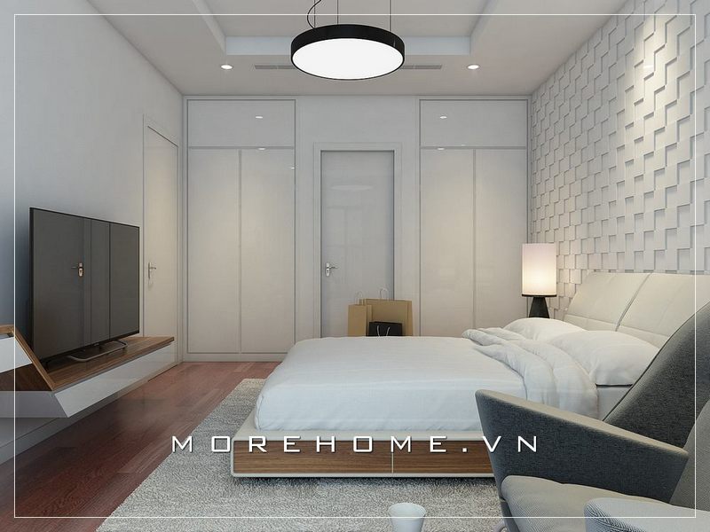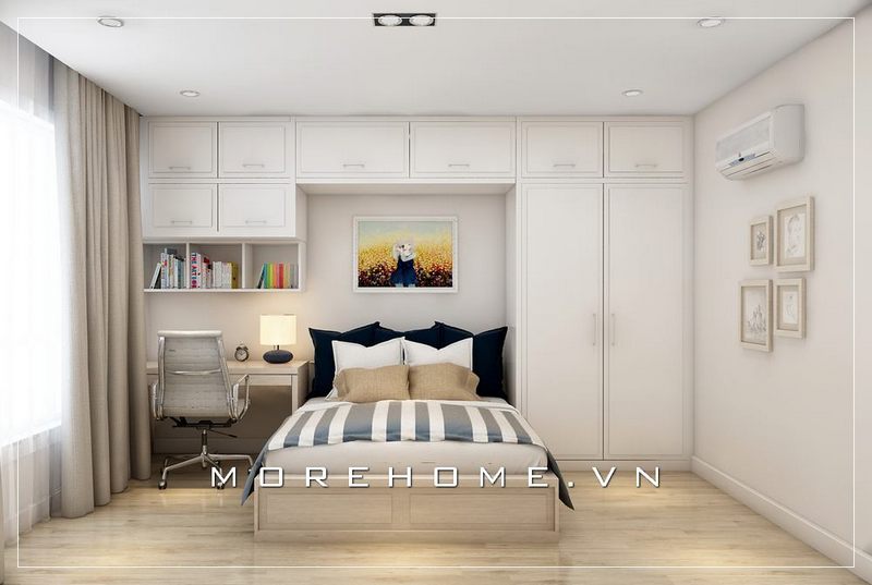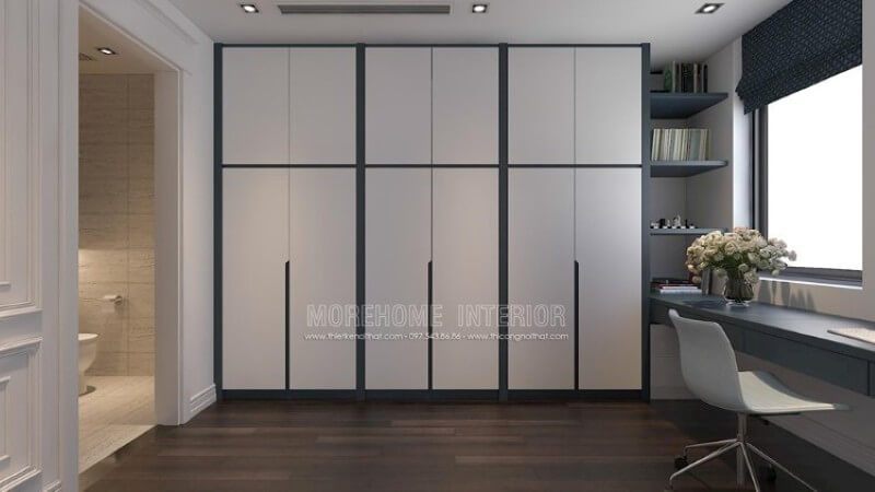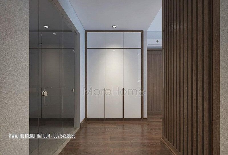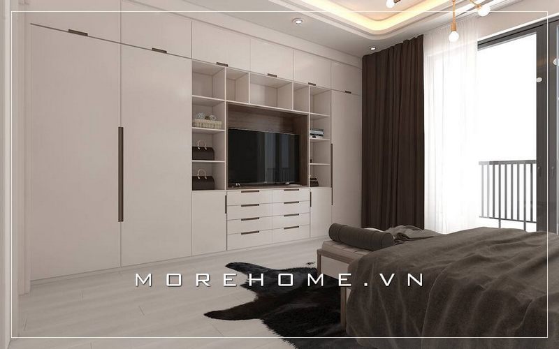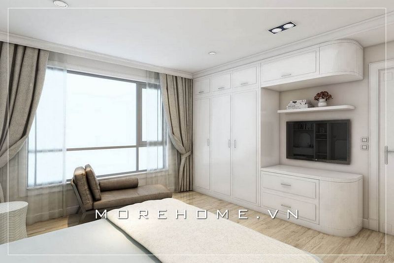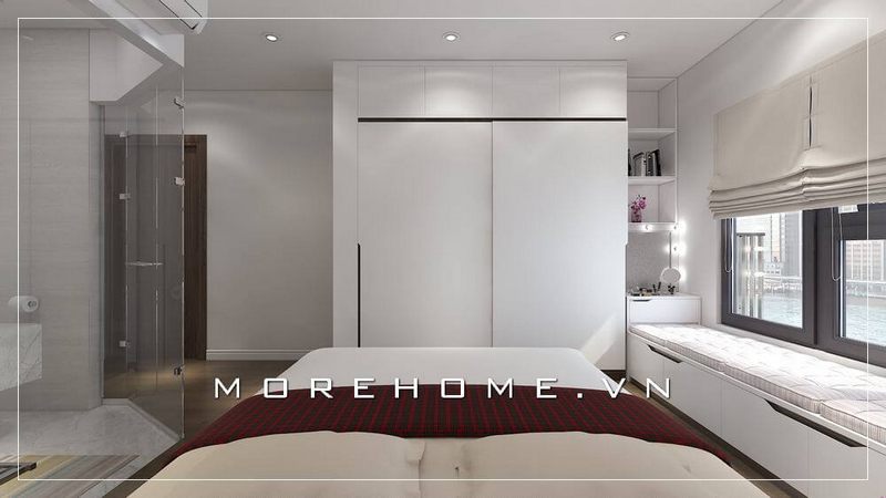 Thiết kế tủ quần áo âm tường màu trắng, gợi cho không gian phòng ngủ thêm rộng và gọn gàng hơn