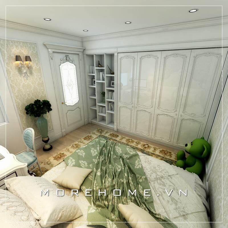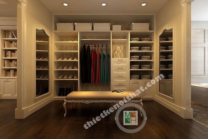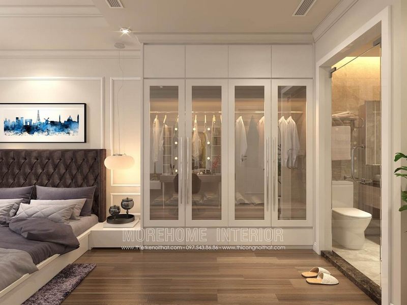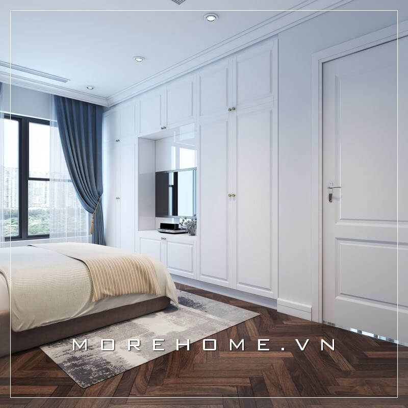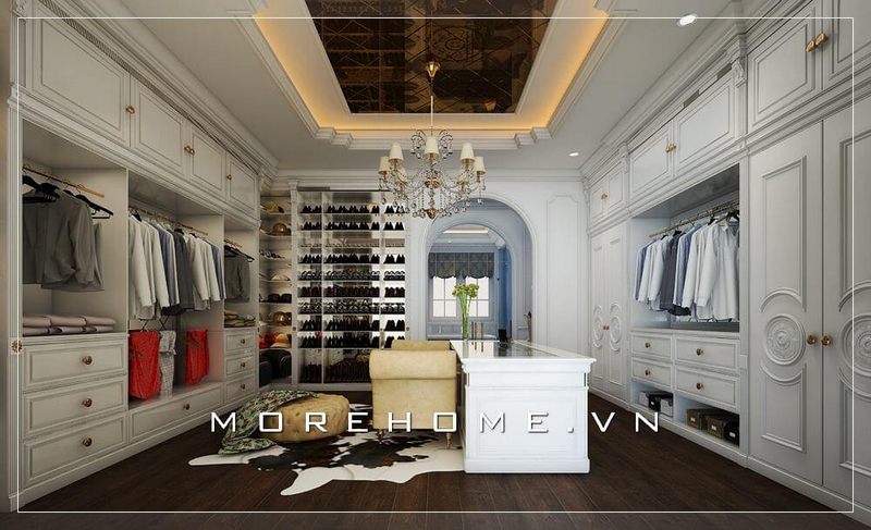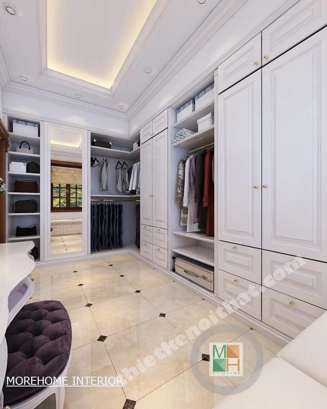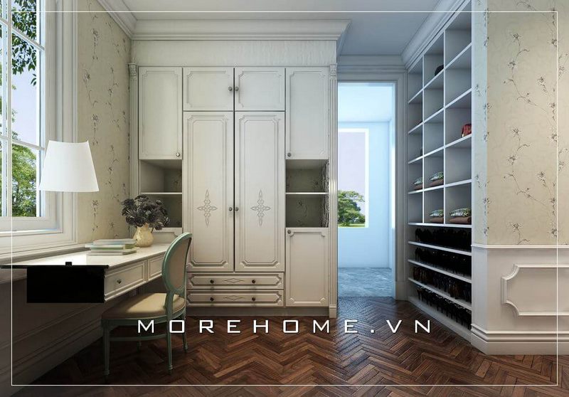 Tủ quần áo biệt thự được thiết kế theo phong cách tân cổ điển, từng đường nét chạm khắc kết hợp với tone màu trắng nhẹ nhàng mang lại cảm giác sang trọng và tinh tế