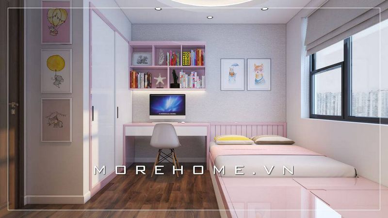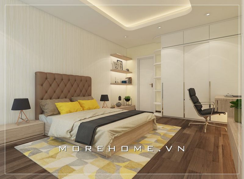Sự kết hợp hài hòa giữa tủ áo gỗ công nghiệp, giường, bàn học cùng chất liệu và tone màu mang đến một không gian nghỉ ngơi đầy sang trọng và tiện nghi