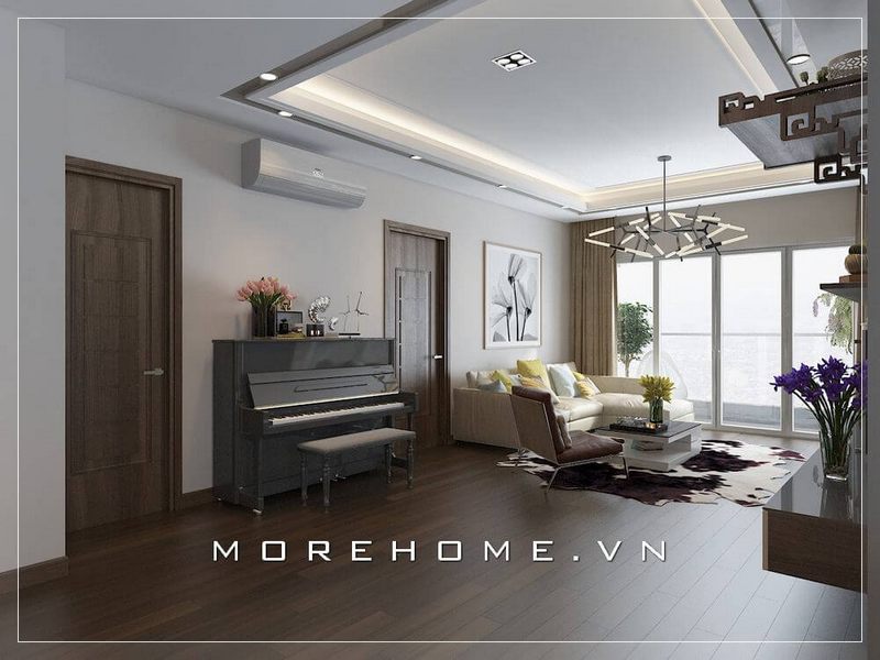 Phòng khách chung cư hiện đại sử dụng sofa góc sáng màu trên nền sàn gỗ óc chó tạo sắc màu tương phản tạo vẻ đẹp độc đáo