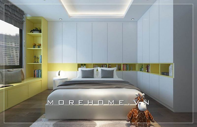 Tủ quần áo trẻ em được thiết kế theo kiểu dáng chữ L chạy dọc sát tường giúp tận dụng được diện tích căn phòng cũng như mang lại sự tiện nghi cho các bé