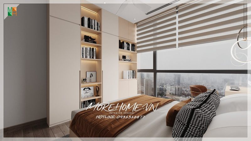 Phòng ngủ với thiết kế phong cách hiện đại được sắp xếp nội thất hợp lí phù hợp với không gian diện tích phòng