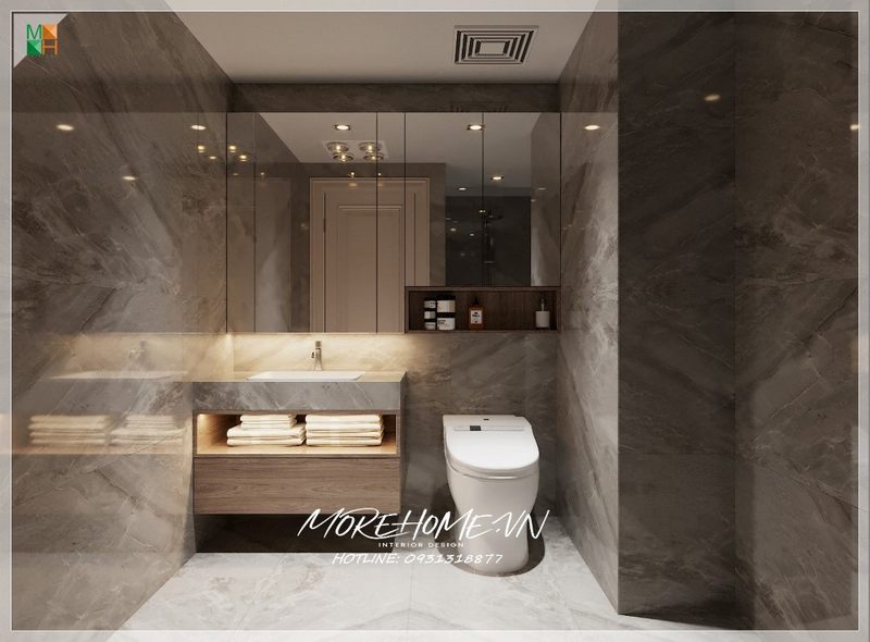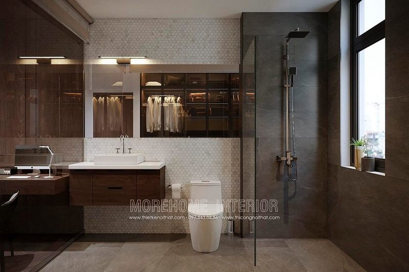 Phòng tắm thiết kế nội thất và tổng thể không gian với tông màu trầm ấm hiện đại mang tới sự mới lạ tạo cho gia chủ cảm giác thích thú.