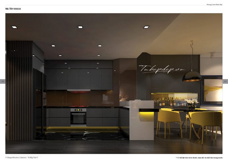 Mẫu tủ bếp acrylic màu xám - bàn ăn mang phong cách hiện đại trẻ trung cực nổi bật trong thiết kế phòng bếp của biệt thự, nhà phố, chung cư cao cấp