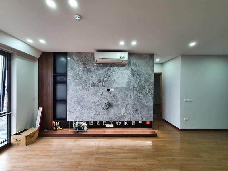 Không gian phòng khách của chung cư kết hợp đá ốp tường cao cấp, nổi bật với vẻ đẹp của những đường vân mây độc đáo.